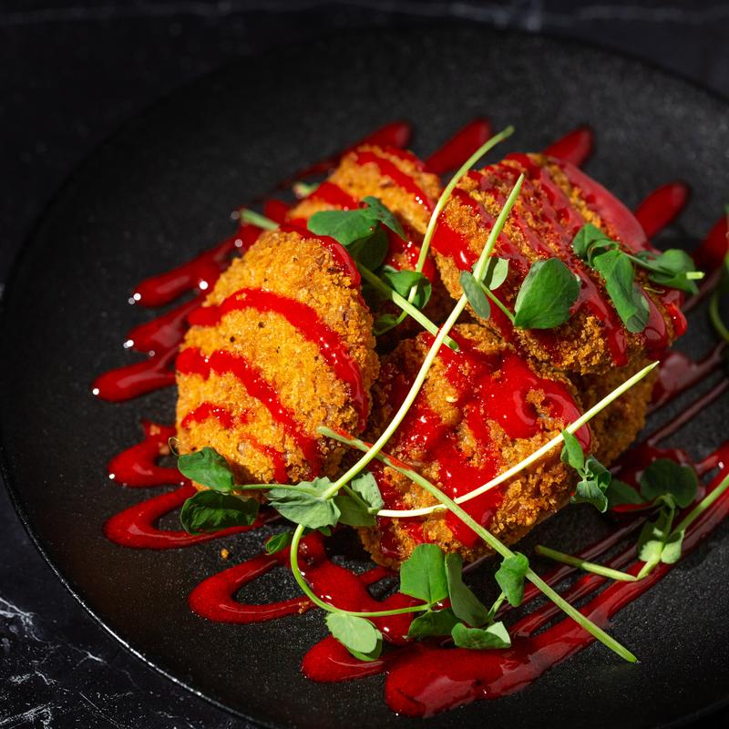 Deep-fried duck confit nuggets, poultry jus, orange gel .